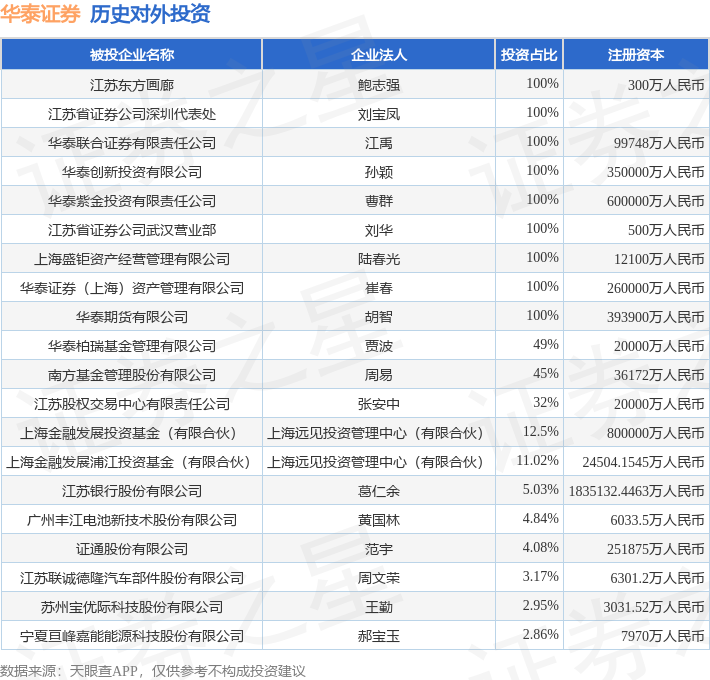 本站音尘,字据天眼查APP显现,华泰证券(601688.SH)新增统统对外投资事件,被投资公司为深圳市联建光电股份有限公司,法定代表东说念主乔建荣,投资占比为0.74%。该公司从事计较机、通讯和其他电子成立制造业,注册本钱为54911.3825万东说念主民币。现在开云kaiyun体育,华泰证券共存在对外投资48项,投资占比前20的样式见下表: