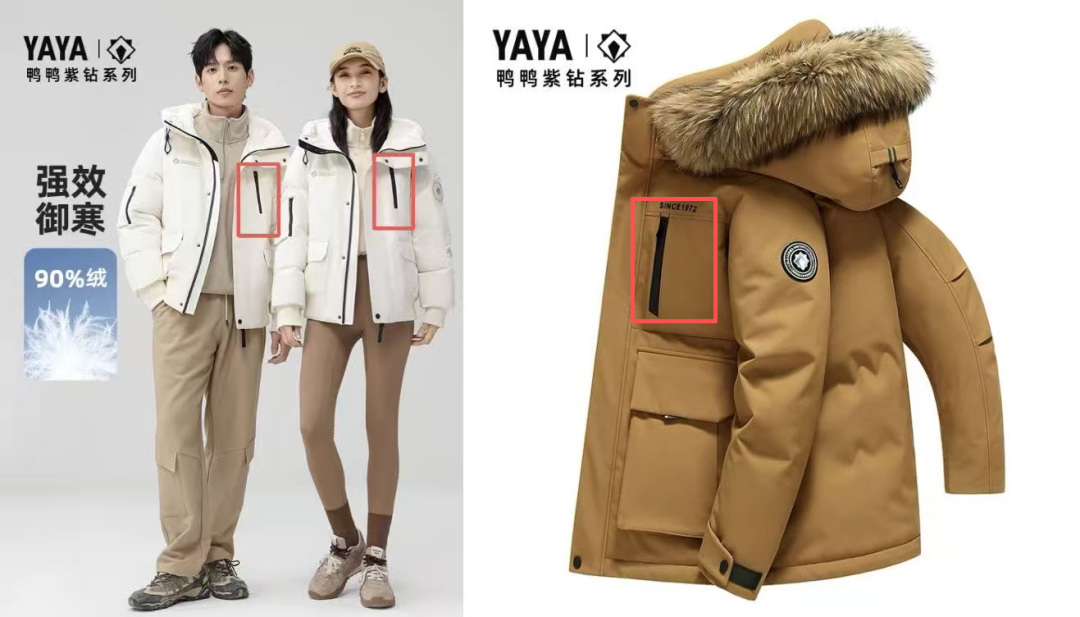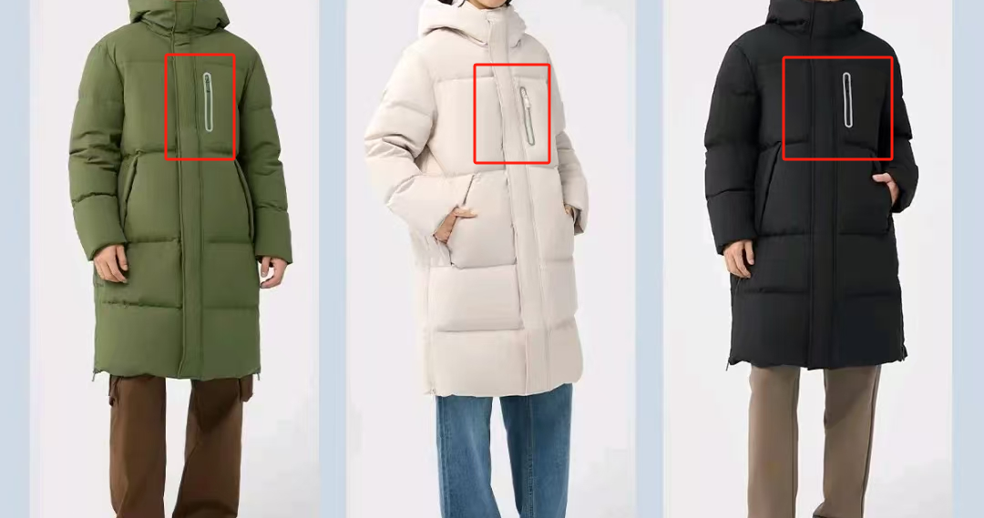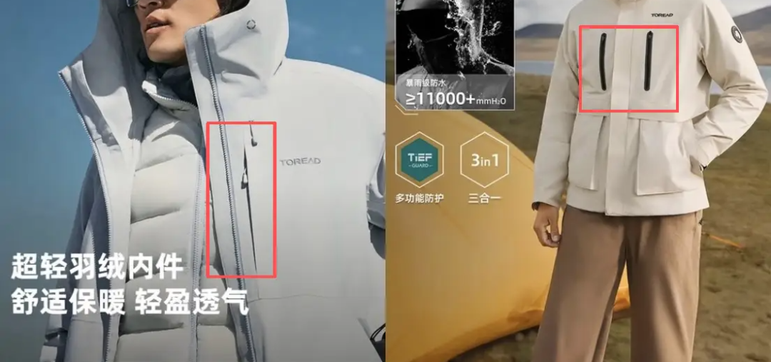 羽绒服、登山服、冲锋衣等外衣上,齐可见这种口袋的身影。比如,鸭鸭的两款羽绒服胸前就齐有竖口袋。