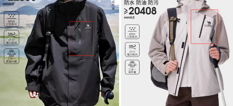 在京东骆驼CAMEL官方旗舰店,销量前三的冲锋衣中,有两款齐有拿破仑口袋策划,且其中一款冲锋衣的拿破仑口袋并非全齐旧例的竖直拉链,而是有一些歪斜角度的。